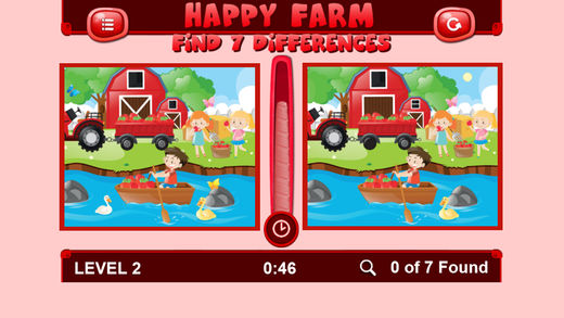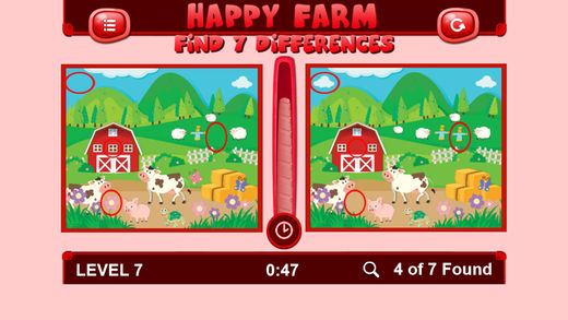 开心农场:发现7处不同是一款非常适合孩子玩的手机益智游戏。游戏非常锻炼孩子的观察力和瞬间记忆能力,需要从图像中找出七处不同的地方才算通关。游戏的色彩鲜艳,卡通的艺术风格都很瘦小朋友喜欢,快来为你们家的小朋友们下载吧!
