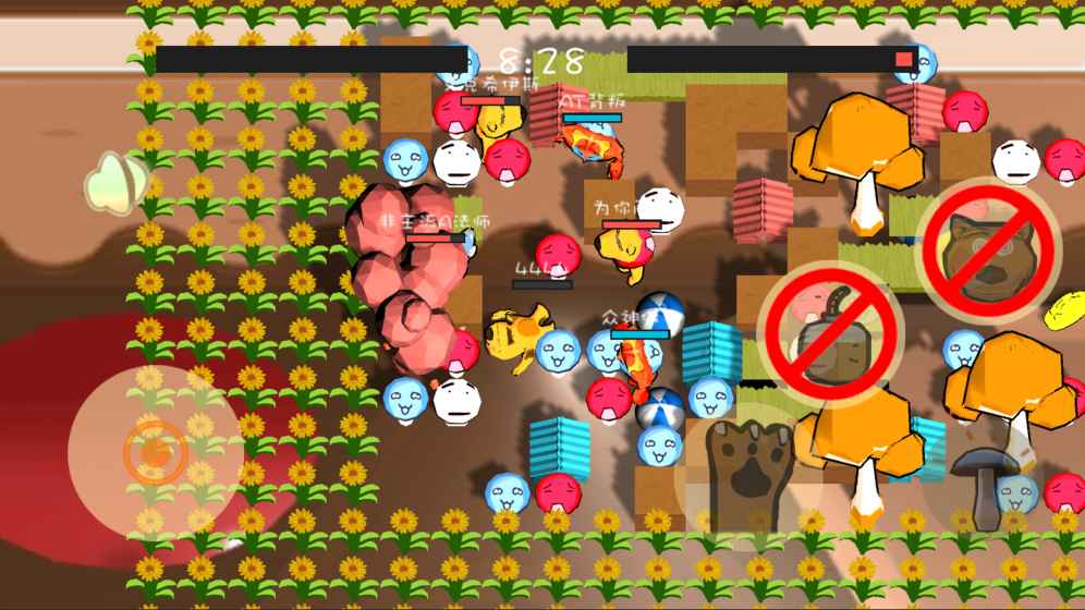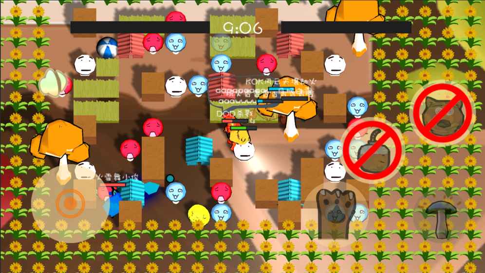 2、如何获得分数? 用蓝蘑菇围住红蘑菇会发生爆炸,爆炸的红色蘑菇会变为分数。(可以借助岩石,地图边缘,树,彩球)