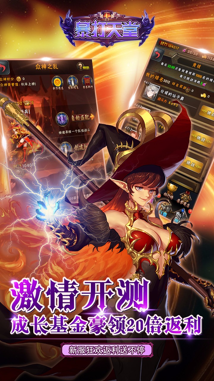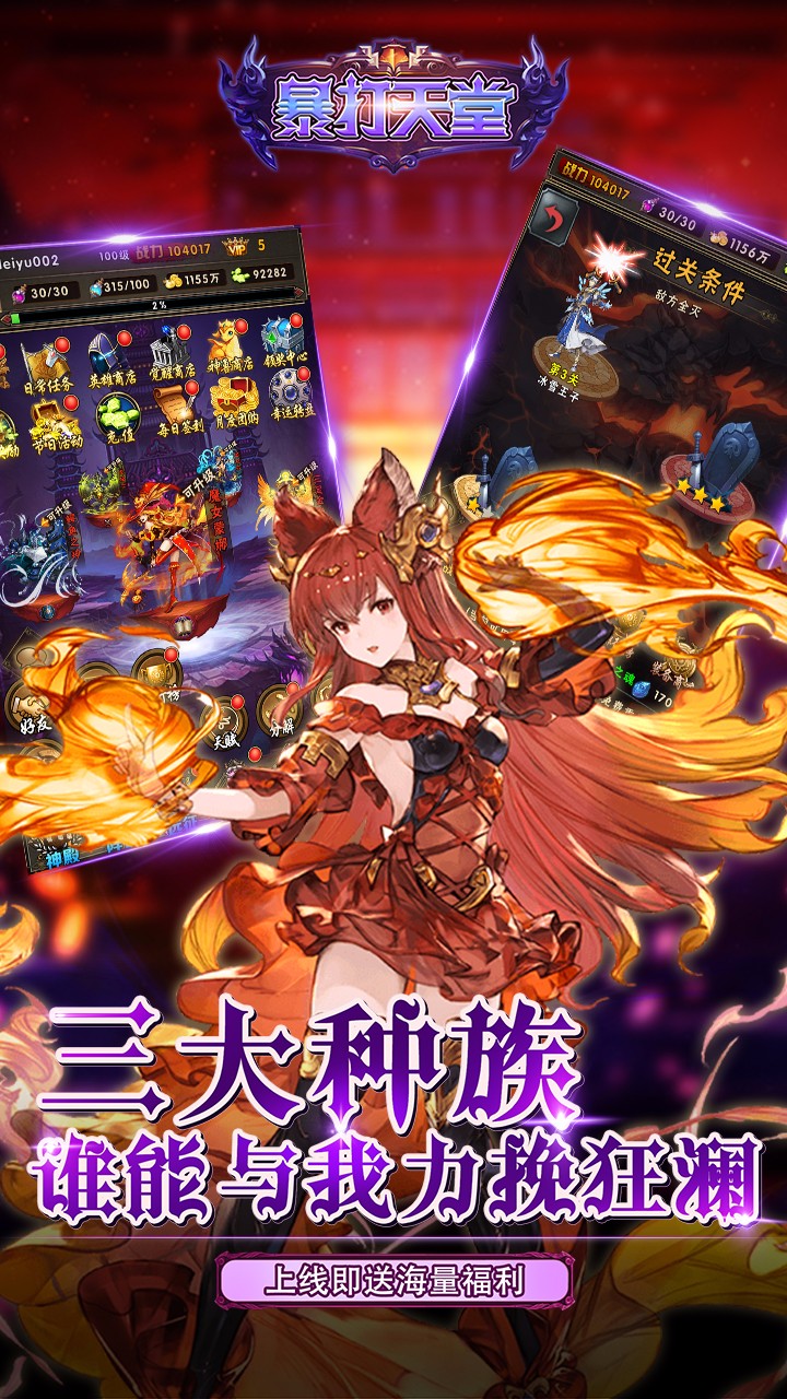 暴打天堂ios版手游是一款以神话剧情为题材的即时战斗类游戏,在游戏中,你既可以玩到传统的卡牌战斗,同时也可以畅享创新的进阶玩法,那唯美的神装和羽翼翅膀,一切全都凭实力获得哦!