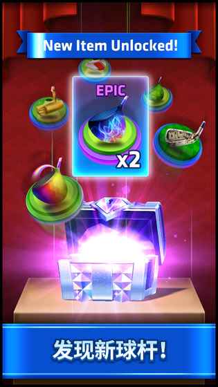 5、解锁宝箱,发现更强大的高尔夫装备,并升级现有的装备: 木杆、铁杆、沙杆、推杆、高尔夫球以及手套!