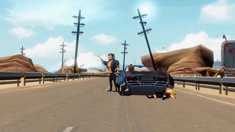 驾驶高级车旅行时显示出主角们的身姿,宛如公路电影。旅途中巨大怪物们的登场,还有各种各样的相遇和经历等待着一行人。在战斗中伙伴间的配合引人注目,场面也能显示出主角庇护受伤了的同伴们。