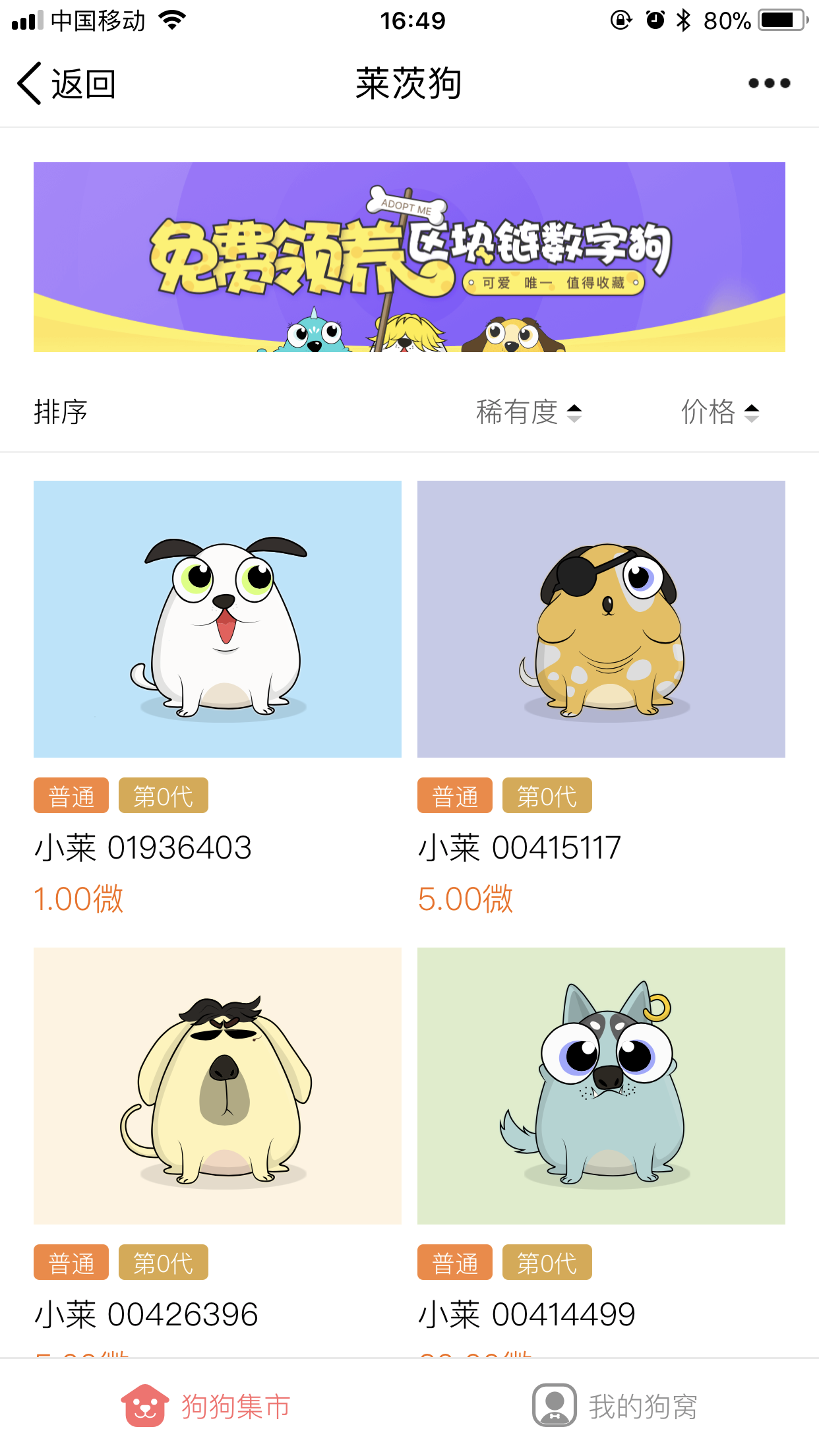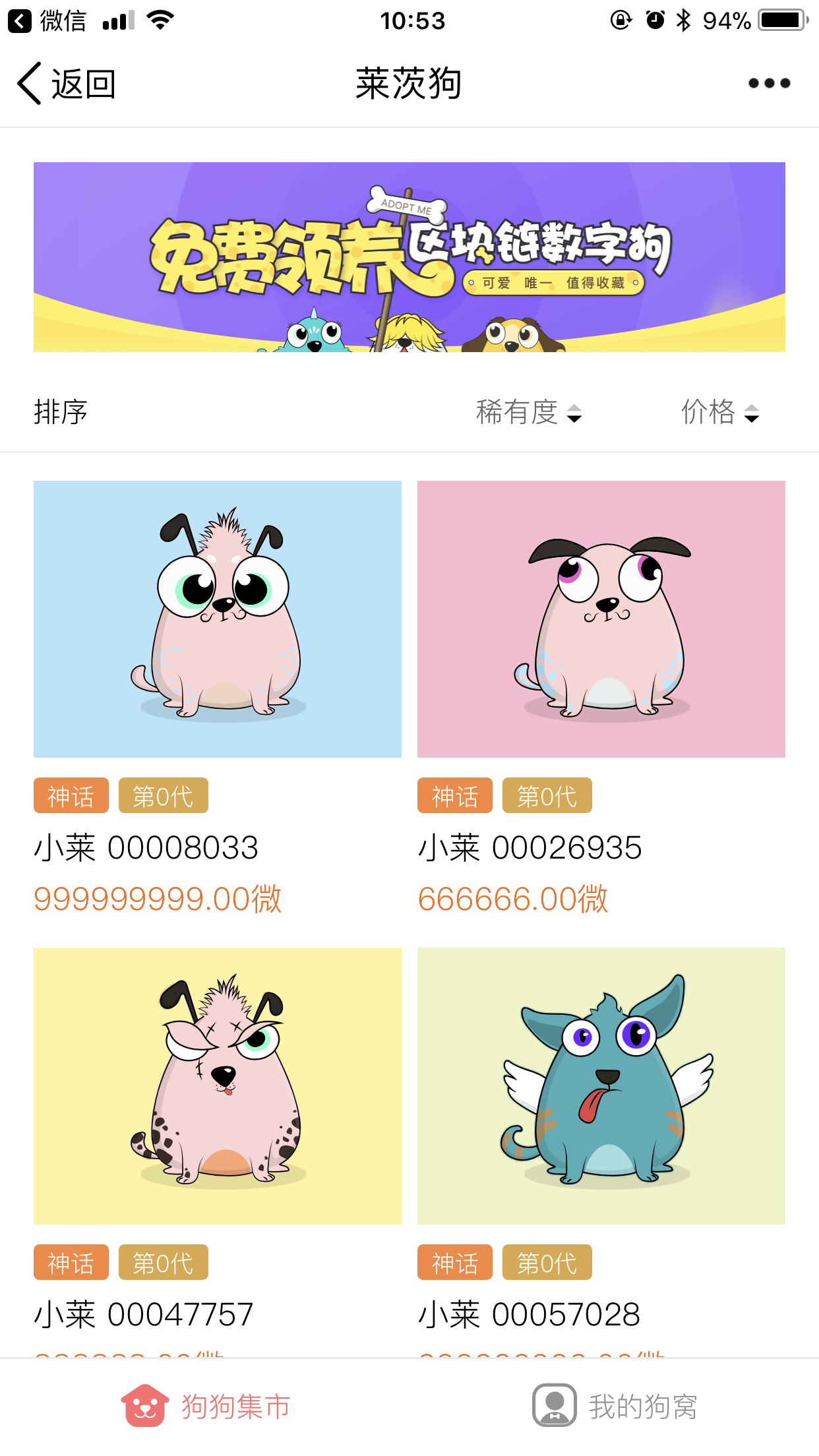 02、当你提交购买订单后,由于订单需要写入区块链,将要一段交易确认时间。待交易确认后,才能在“我的狗窝”看到你所购买的莱茨狗。