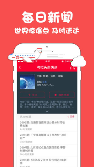 即时新闻:听伴的新闻团队由搜狐新闻的核心团队构成。听伴24小时新闻报道不仅领先所有手机电台,甚至比搜狐新闻,新浪新闻,网易新闻等专业新闻APP更快直播。