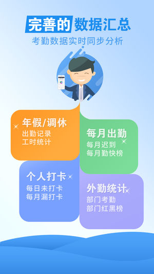 =在手机上打卡,移动中签到,轻轻松松不迟到!=公司组织架构通讯录,美女帅哥随便撩!=随时随地一键发申请,移动考勤数据直接生报表!