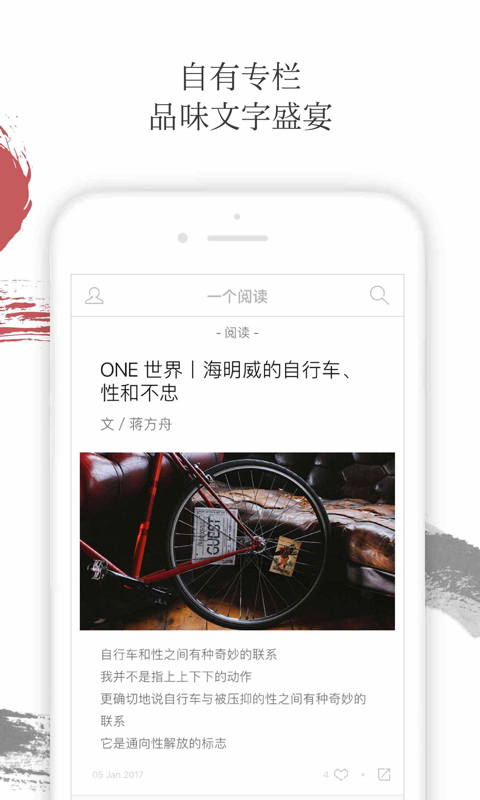 4.《ONE·一个》App 是韩寒的杂志团队首次推出的 ios 电子杂志,也是继韩寒今年6月份与腾讯合作《一个-韩寒》栏目后第一次在移动电子杂志方向的试水。