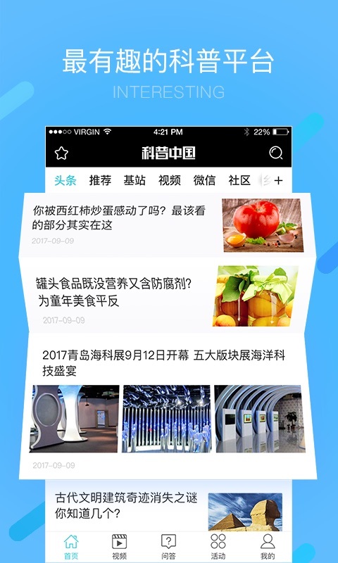 3.科普中国系列分类的移动端APP入口和集中呈现,目前主要包含科普头条?基站、社区基站,以及我国部分科普网站、科普栏目、移动端科普应用等的汇聚。