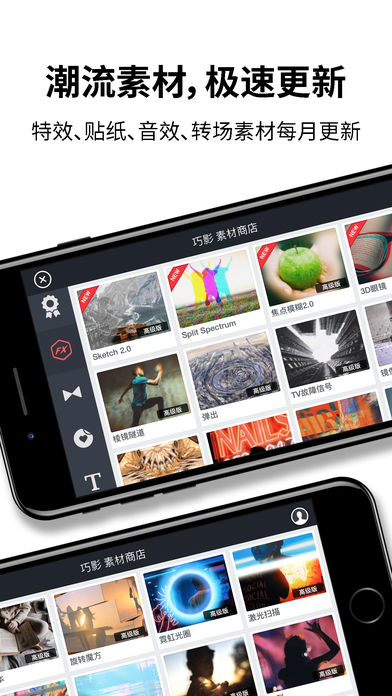特效、贴纸、音效、转场素材每月更新,更有iKON、BIGBANG、SECHSKIES、会说话的汤姆猫家族、B.Duck小黄鸭、蛋黄哥官方授权视频素材!