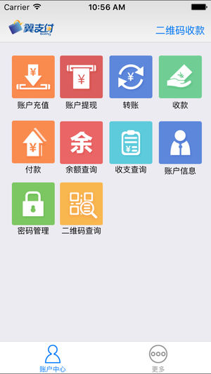 并支持具有商户的二维码名片功能,支持翼支付个人用户扫描二维码支付;还具有账户信息查询、密码修改、公告消息等基础服务。