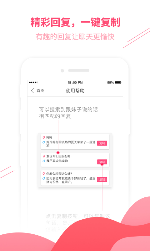 遇知音这款游戏是这款软件是一款撩妹话术的手机App,在这个软件中可以学习如何撩妹的软件,这里可以学习到男生是如何搭讪美女的哟!喜欢的朋友快来下载吧!