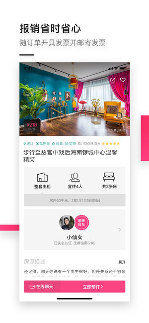 你可随时随地打开小猪APP,选择自己喜欢的特色房源或房间,查看房源照片,了解房源和房东的介绍及价格信息,并与房东进行在线沟通,第一时间掌握这些短租日租房、民宿客栈或是酒店式公寓的详情,轻松完成住宿预订。