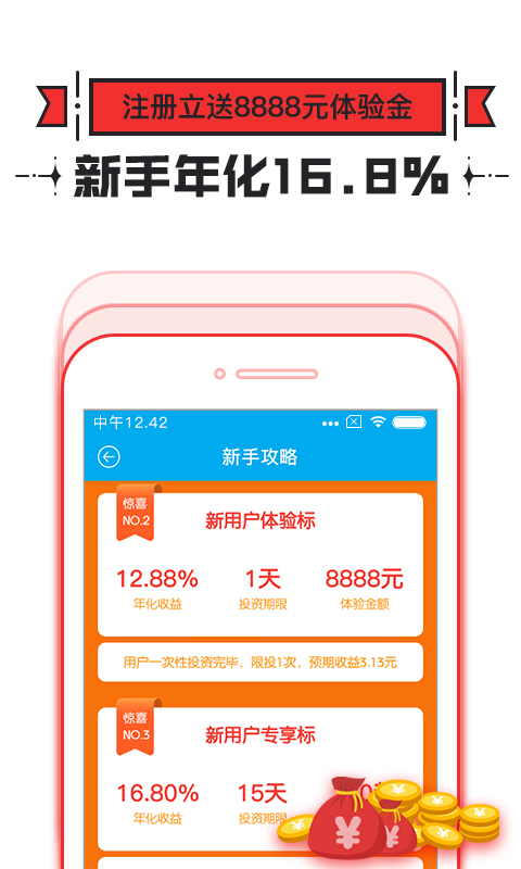 2.新手好礼:8888元体验金、16.8%超高收益理财产品、6000元本金券