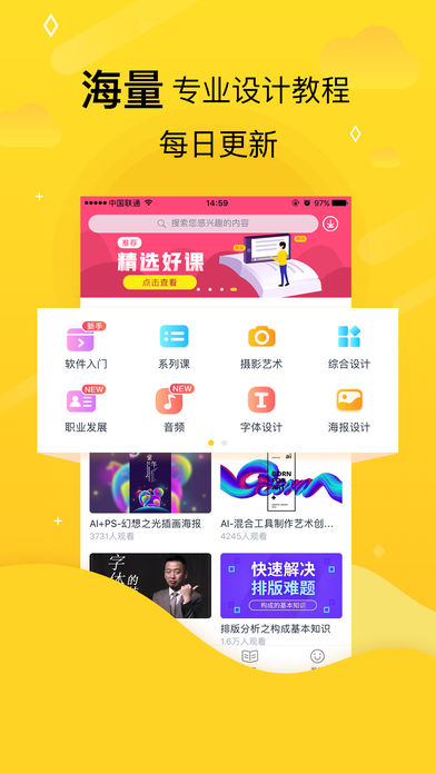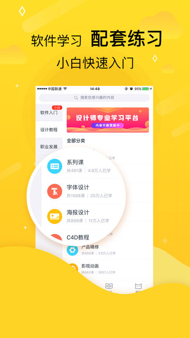 教育内容覆盖PS(photoshop)、UI、AI、C4D、AE、Excel、PPT、Word、pr、3Dmax、ar、cdr、CAD、摄影、lightroom、dreamwaver、praianimate、premiere、sketchup、sketch、犀牛、autocad、sai、painter、cdr、illustrator、maya、indesign等软件,通过字体设计、海报设计、软件入门、C4D教程、图像合成、产品精修、影视动画、职业发展、印刷设计、人像精修、商业插画、店铺装修、设计思路、图像后期、特效制作、卡通形象、摄影、平面设计、等不同知识点,让学员可以更全面学习设计知识。