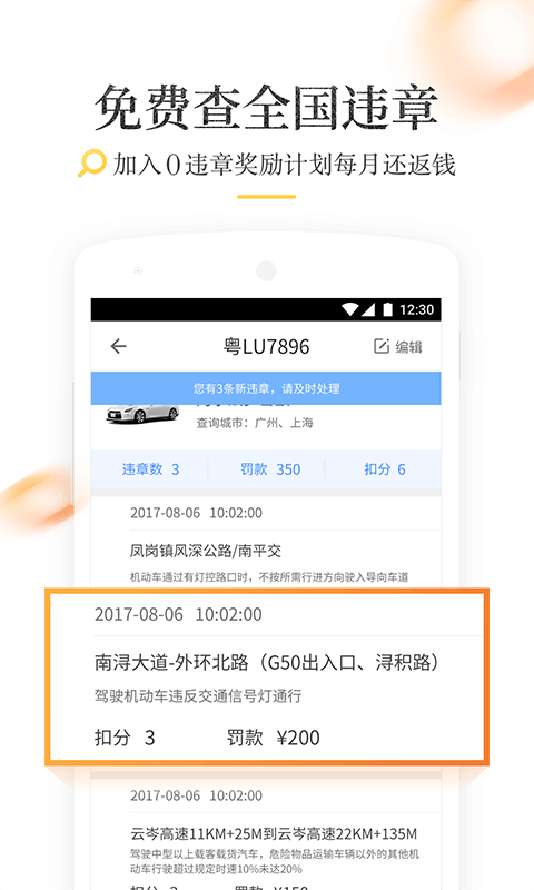 ①查违章全新改版——马上加入我们的车主公益计划,每月坚持不违章就能领现金!