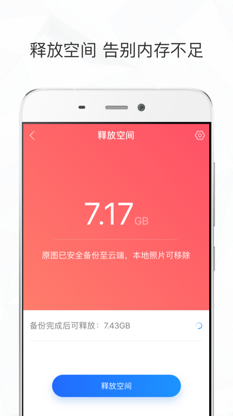 【释放空间,告别空间不足】使用释放空间功能将自动备份照片并移除手机中已备份的照片,再也不用担心手机空间不足了~