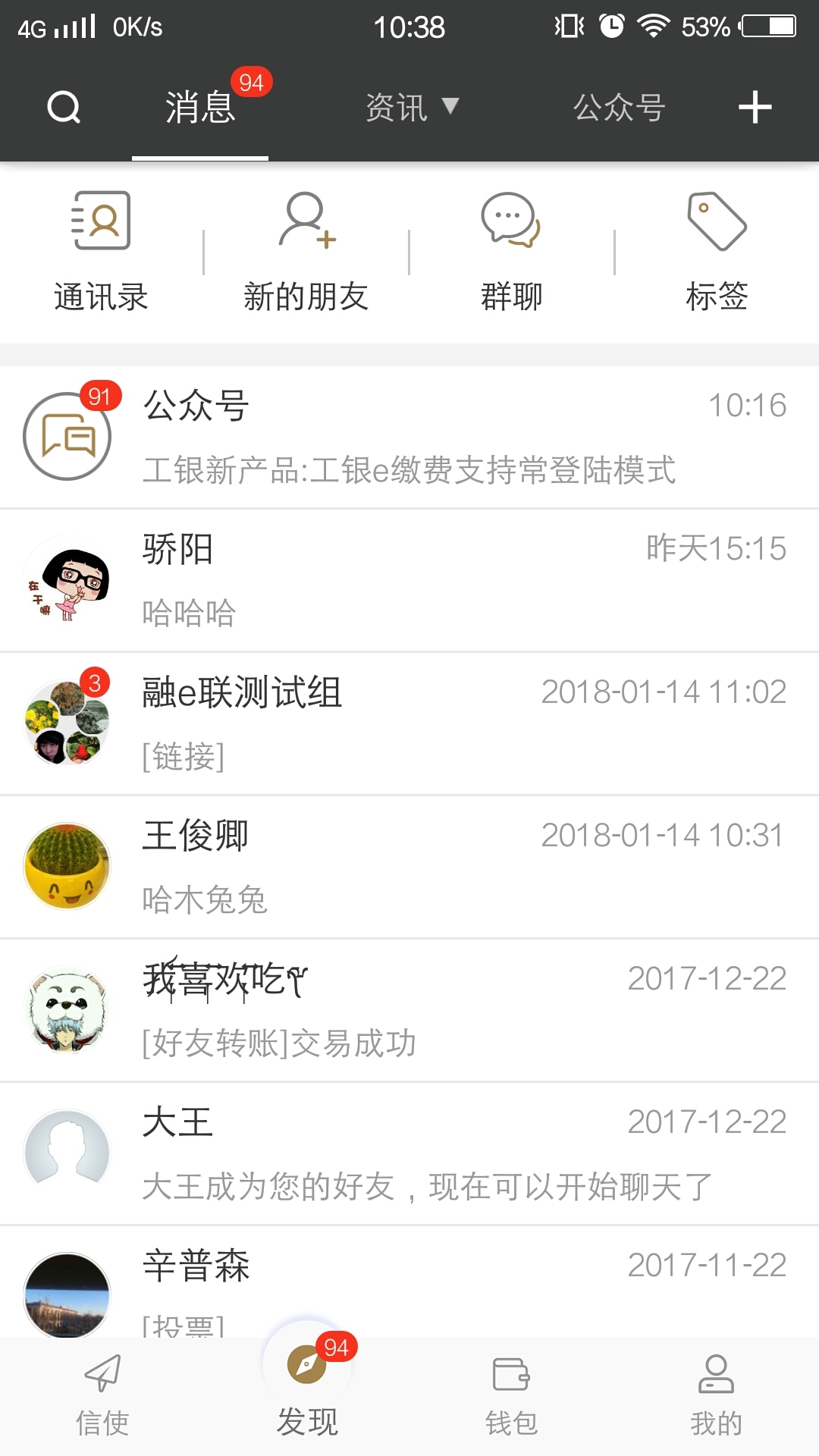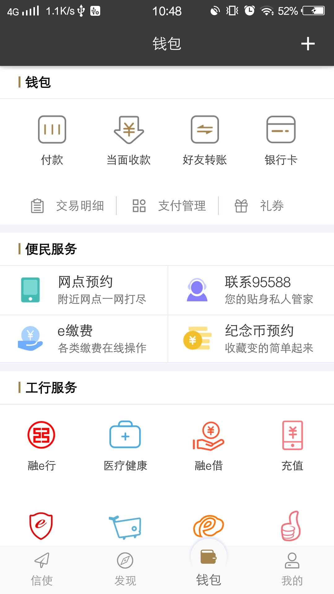 全新的信使、发现、钱包栏目,助您轻松打理账务、便捷查阅信息、消费与服务一点通。