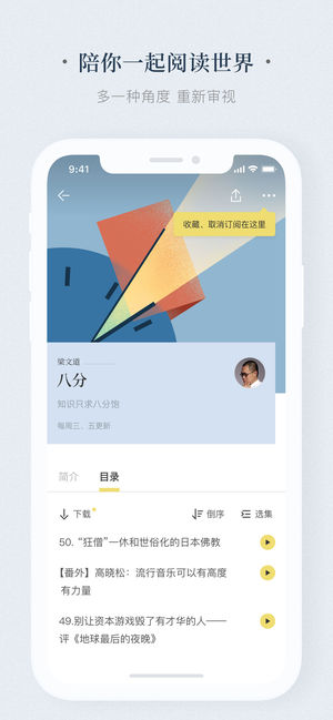 为您打开新的世界。我们全新制作了梁文道的脱口秀音频节目《八分》,以及看理想编辑团队精心炮製的“电台杂志”,同时还提供所有看理想系列视频节目(一千零一夜、圆桌派、局部、听说)的音频版本,以声音结合图文的形式,让您感受知识的趣味。