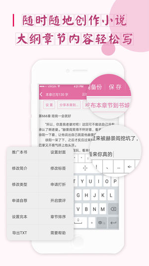 3,支持一键发布小说到书城、支持定时发布新章节,让千万读者阅读您的小说。可以和读者交流互动,可以得到读者的打赏和礼物。符合签约条件的小说可以直接和我们签约,赚取稿费