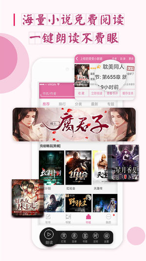 4,支持在线和离线阅读热门小说,耽美小说、TFBOYS小说、EXO小说、明星同人小说、校园言情小说、侦探悬疑推理小说、恐 怖小说等各类热门小说应有尽有,同时支持导入本地看小说,支持语音朗读小说,支持普通话和各种方言朗读,解放双眼、保护视力