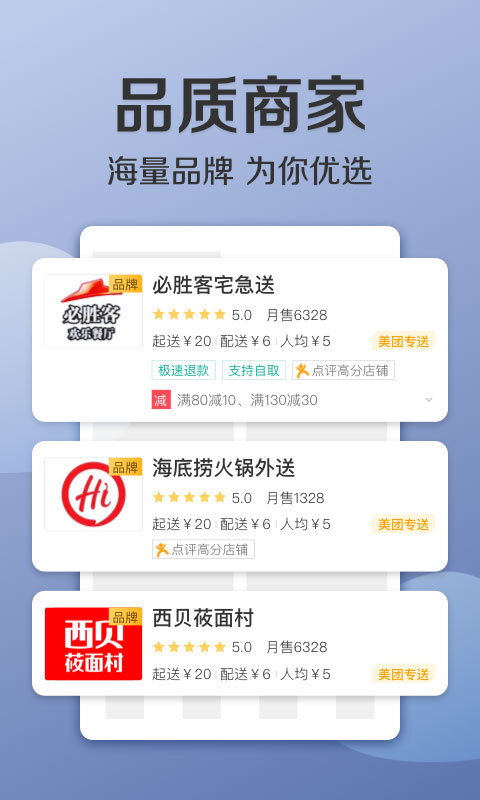 美团外卖为您提供各类品牌外卖,美食商家订餐服务。套餐优惠,支付满减,下单抢红包优惠更多,还送餐后饮料水果哦!