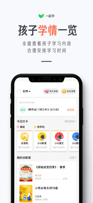 【提升孩子学习效率】 学习规划:自动提醒,鼓励坚持打卡式学习,培养孩子终身受用的学习习惯; 家长奖励:对孩子优秀的学习行为及时鼓励,提升孩子学习动力,帮您更好的进行亲子互动。 权限管理:科学管控孩子在使用一起小学学生app的独立行为,松弛有度; 科学护眼:根据学生在一起小学学生app的学习时长定时弹出护眼提示,提醒孩子休息眼睛、远眺放松。更有夜间护眼模式、行为不规范护眼模式等进一步保护孩子视力健康。老师推荐的练习有建议时长提示、家长也可以自主控制、调节孩子的使用时长,科学合理使用电子产品,帮助孩子全方位养成良好的学习和用眼卫生习惯;