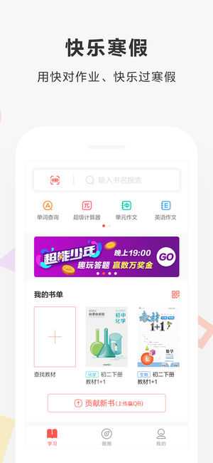 快对作业是一款为学生服务的软件,你只需要拍下题目就可以进行题目的搜索,还能欧找到相关的书籍,让你的学习效率大大提高,家长们再也不用担心孩子们的作业了。