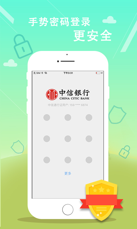 首次登录中信银行手机银行时,如果用户密码设置较简单或者是纯数字,系统会要求改密码,并且要求设置安全问题,用户可以绑定头像。登陆成功后,页面有安全提示,包括用户姓名、预留信息、日期、上次登录时间、登录次数。