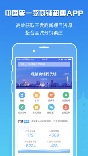 1、共享商业项目房源:卖铺宝通过优铺品牌及平.台赋能,整合本地房地产开发商商铺房源,将其共享给本地渠道经纪人进行招商、销售。