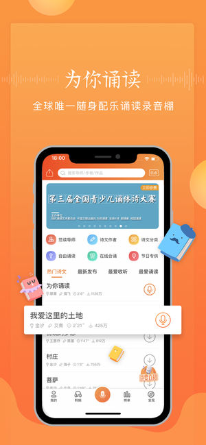 为你诵读app是一款别有诗意的软件,为你诵读app中聚集了一批爱诗歌和朗诵的朋友,你可以和他们一起交流学习,也可以展示自己的作品,非常的不错。