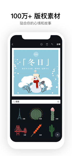 从我们包含 300 多万张图片的图库中选择,或者使用数百种免费的元素和字型进行设计。可以将设备相册中的图片直接上传到设计中,也可以随时在应用中拍摄照片。