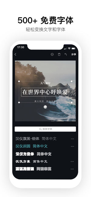在图片中添加文字或标题,让设计具有你自己的个性。按照你的风格从 100 多种字型中进行选择。调整文字的字型大小、颜色、位置和旋转,完善你的设计图片。