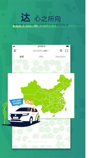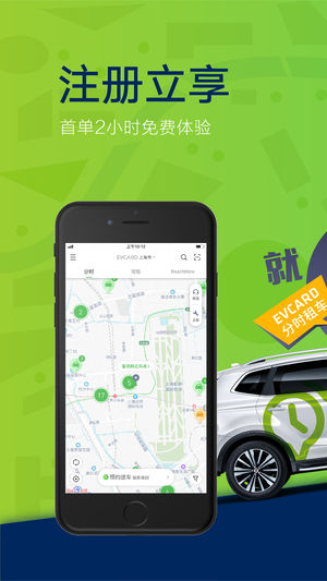EVCARD电动汽车分时租赁是借助物联网技术实现的一种新型汽车分时租赁服务模式,实现了用户任意时间自行预订,任意网点自助取还的用车需求。