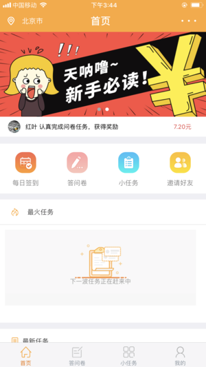 拼任务是一款比较实用更多app,用户们只需要完成任务就就可以赚钱,在线回答问题即可,是一个轻松方便的好差事,喜欢的快来下载吧。