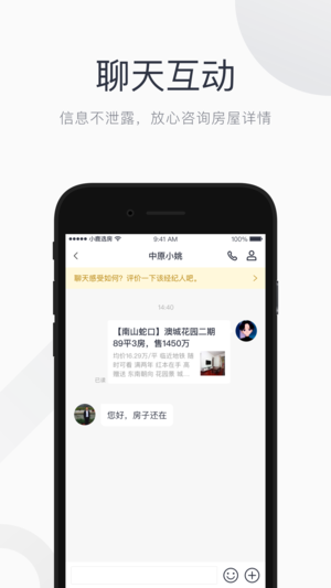 在报价人中挑选分数更高,更专业的经纪人,发起聊天咨询。也可以等待经纪人主动聊一下,精细的权限设置让你不再担心无谓骚扰。