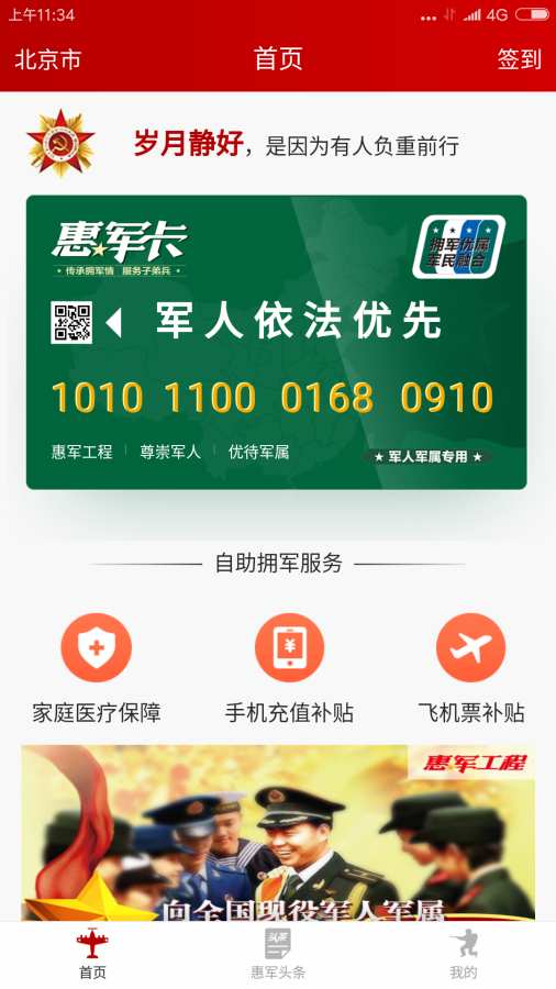 持惠军卡享购物、通讯、医疗、保障、加油等惠军专属优先优惠服务。