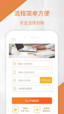 4、操作简单:通过手机即可填写资料、发起申请、在线等待审核、收款、还款;