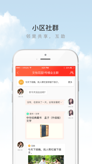 在线可以与同个社区的人互动,随时可以在线分享生活动态;