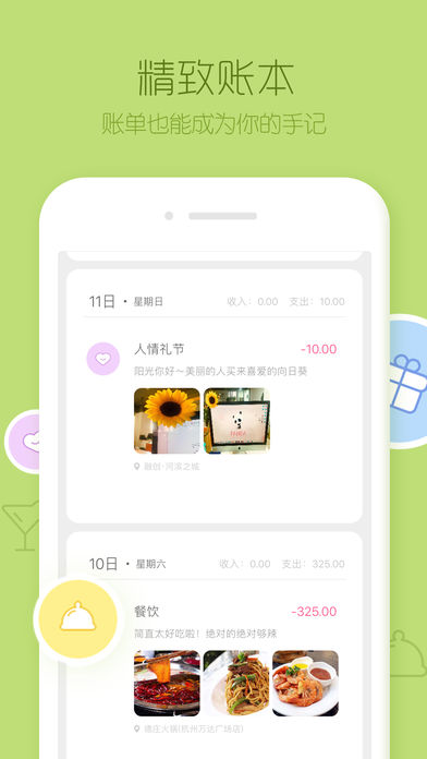 *时间轴记账:通过时间轴显示账单,还可添加照片、实时位置,让琐碎的生活变得高逼格。
