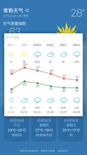 常熟天气app拥有十分精致美观的界面,它占用的系统资源很少,没有任何垃圾广告,能够给用户带来极致流畅的使用体验,是常熟人必备的手机天气软件。