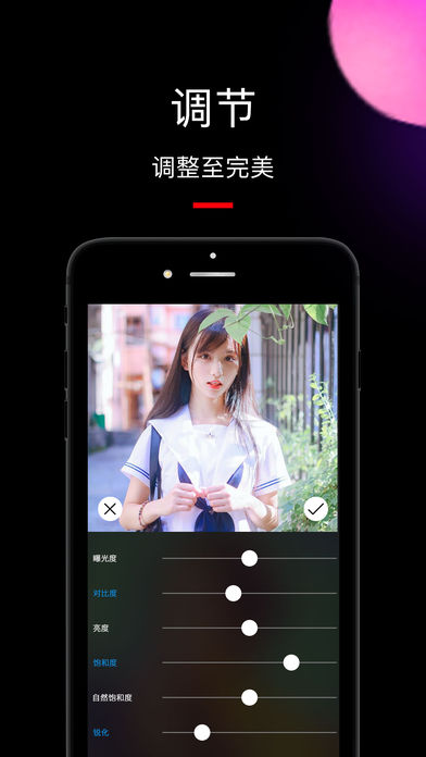【图片参数调节功能】包含对比度、亮度、晕影、色温、饱和度等参数调节功能。