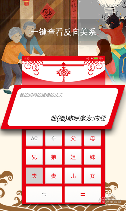 临近春节,为了解决您串亲时不知道对方叫什么的尴尬,我们特意推出了亲戚计算器,简单的界面,无任何学习成本,准确的计算您的亲戚之间的称谓关系,本计算器结合实际,只可以计算到四代以内,若有更多的需求,您可以反馈给我们