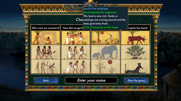 游戏将带玩家回到埃及前王朝时期,回到公元前5000年,并带领游牧的埃及部落一起克服万难,统一上、下埃及,奔向繁荣富强的未来! 整个国家的命运完全掌握在玩家的手中。在各种真实历史事件、战争和灾难面前,请谨慎地做每一个决定。在游戏中,从古埃及人的角度去体会古代世界的神秘氛围。