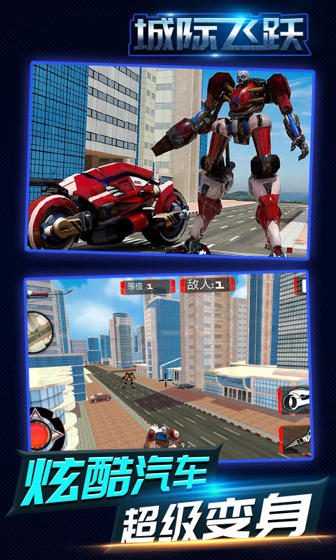 城际飞跃游戏是款以机器人为主题的动作射击类游戏,在游戏中玩家将体会到各类熟悉的机器人,从城市的这边在飞越这边我,哇!这的好神奇好好玩啊,来游戏选择你喜欢的机器人,来游戏就下载体验吧