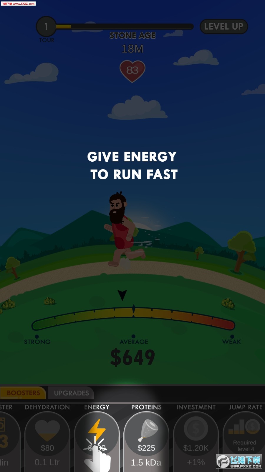 1、放置类玩法,点击屏幕,奔跑者轻松赚金币,玩家不存在金钱困扰。