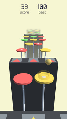 玩家要操作一个小方块在一个个平台上跳跃。方块的颜色会在红黄双色中随机变化,而平台也分为红黄两种颜色,玩家必须看准方块颜色与平台颜色,通过点击屏幕左侧大跳、点击屏幕右侧小跳,让方块落在对应颜色的平台上,否则就会马上game over 了。