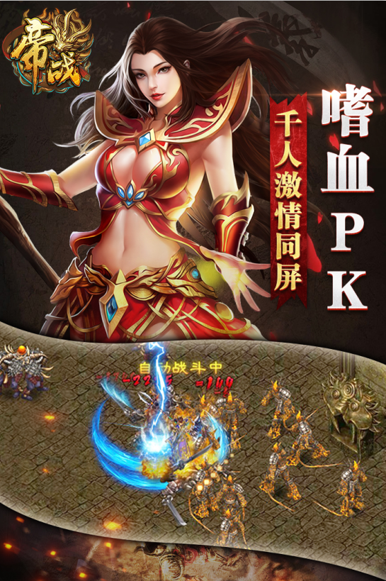 《帝战》是一款热血传奇类的2DMMORPG手游.简单而不失微秒的游戏操作,完美的职业搭配,不可替代的PK感受,行会战争等群战体系,让帝战拥有了独一无二的经典魅力!好友、组队、行会等丰富的社会架构,更让玩家在兄弟中冲锋体验人生百味。《帝战》传承十年传奇经典,血战到底,成就王者! 十载传奇梦,同样的千人攻沙,不一样的打怪爆装,这是属于我的世界。 战法道经典三职业,携兄弟齐心战天下。