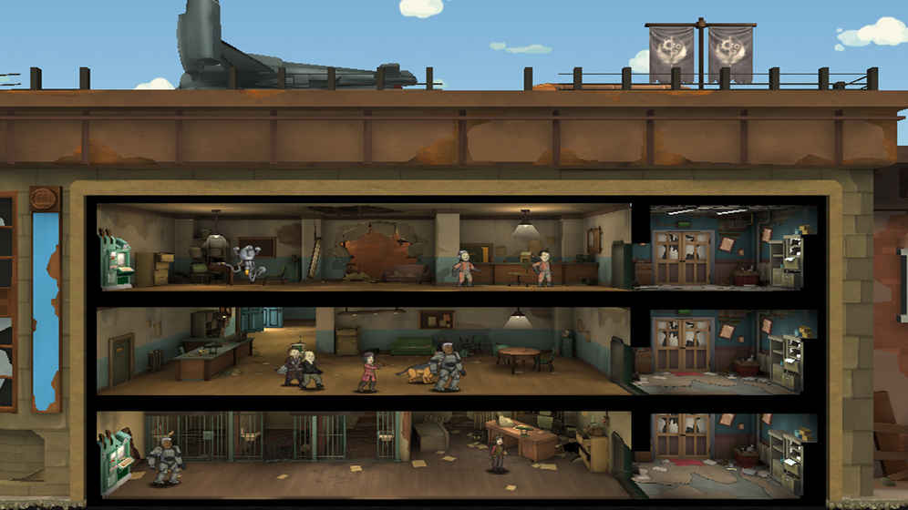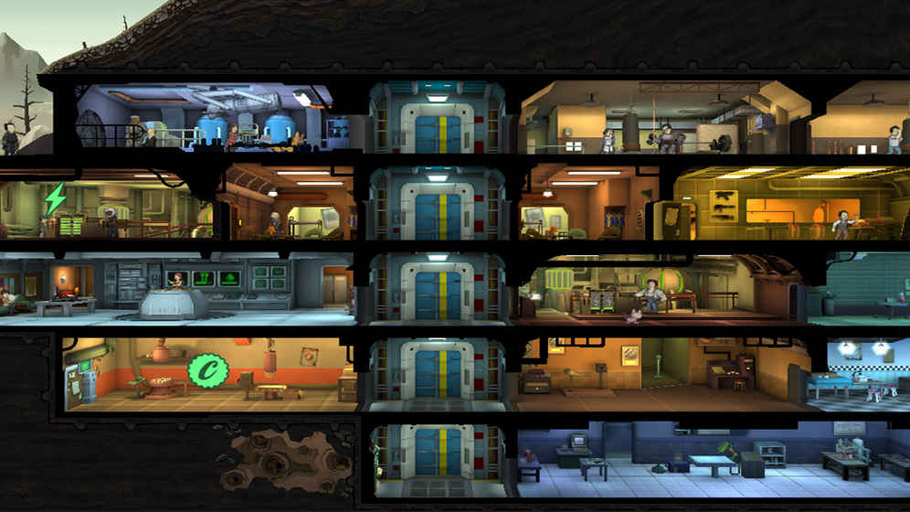 资源收集:以电、粮食和水作为经营的主要要素,以瓶盖作为游戏的主要流通货币,玩家需要做的就是合理利用资源将避难所进行扩张和让避难所的人满意。