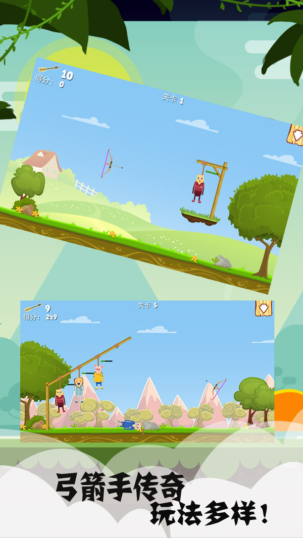 游戏准备了很多关卡,每个关卡的难度也不尽相同,有些是射出的弓箭有限,有些是在目标和弓箭之间设定了很多的障碍物,你需要动脑筋,又要配合自己的动手能力,射中目标。