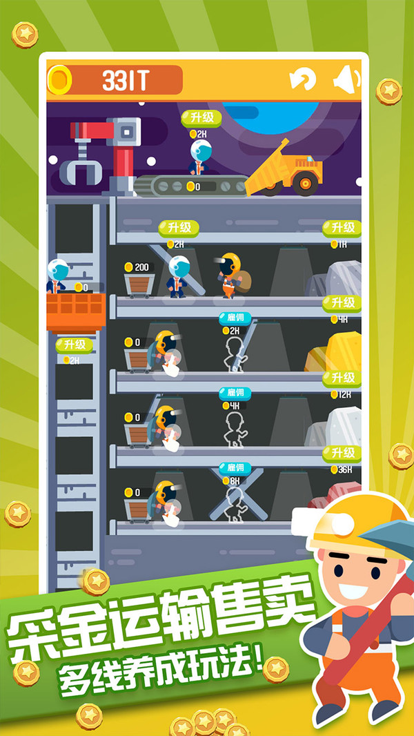 这是一款很有个性的像素放置挂机挖矿手游,游戏汇集经营养成、角色雇佣、升级、元素收集、扫雷小游戏、魔性戳屏幕于一体,还配以温馨感人的剧情故事贯穿全局,迷宫冒险闯关、地心挖矿等诸多独具创意且风格迥异的游戏玩法。在这里,你可以体验成为飞机大亨的模拟人生! 游戏讲述了主角的首富商业地产大亨父亲失踪,主角在冒险岛上继承父亲留下的采矿大亨公司,通过挖矿构建飞行帝国,去月球拯救父亲的故事。游戏中分为开采、炉石搬运、升降运输、售卖等多个可操作环节,可以点击屏幕进行挖矿,也可以雇佣合适的帮手来协助你经营、开采、搬运、售卖金矿,以获得更多的金币,不断开发新的地基,最终升级公司获得足够的资产制作黄金矿工飞船!来体验飞一般的成长之旅吧!