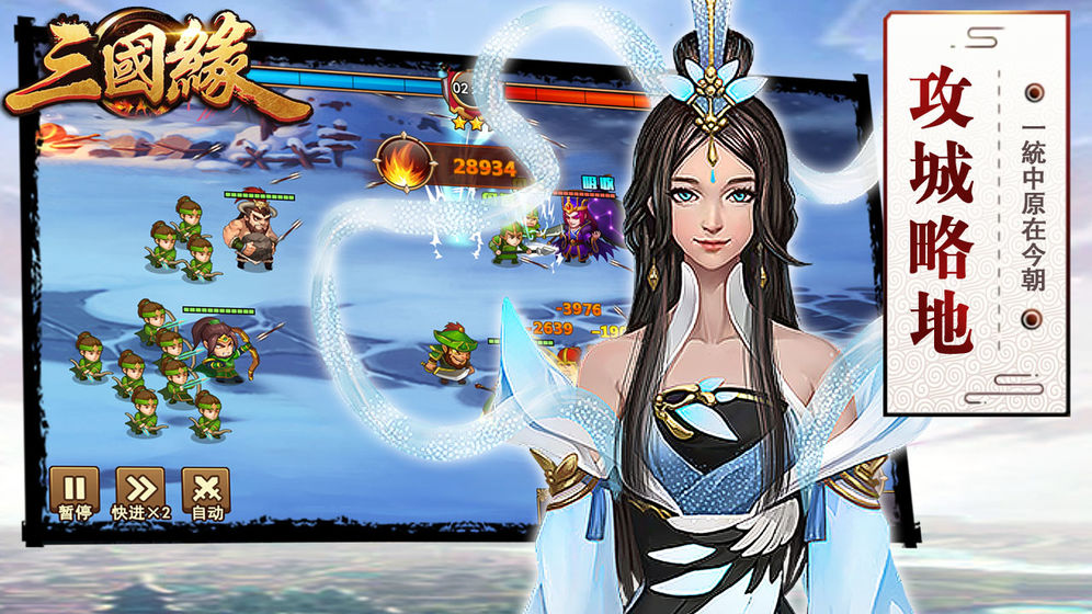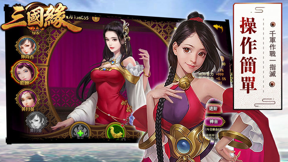 以真实三国历史作为背景,收录多个经典战役作为副本关卡,豪华武将阵容,特色武将天命系统,深厚的将帅羁绊助您征战三国,巧妙的布阵、合理的将帅搭配将会使你的阵容所向披靡无人能敌,战力靠对图鉴、美人等加成系统的培养来提高,每日系统将根据玩家参与的玩法发放丰厚的资源供玩家培养武将,我们将尽量减轻玩家的资源获取压力以享受更加纯粹的策略竞技。