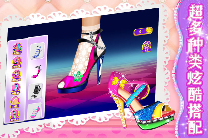 百种饰品随心搭配,自己手动打造最漂亮的皇家高跟鞋!发挥自己的创意,色调,饰物,花纹随你组合,搭配出个性高跟鞋!皇家公主专用作坊,一起来寻找属于自己的个性套装!